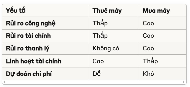 Case study: Startup D-Tech bắt đầu với máy thuê cơ bản 800K/tháng. Sau 8 tháng phát triển, nâng cấp lên máy 2.5M/tháng. Nếu mua máy từ đầu với giá 45 triệu, họ sẽ lãng phí 30 triệu trong 8 tháng đầu.